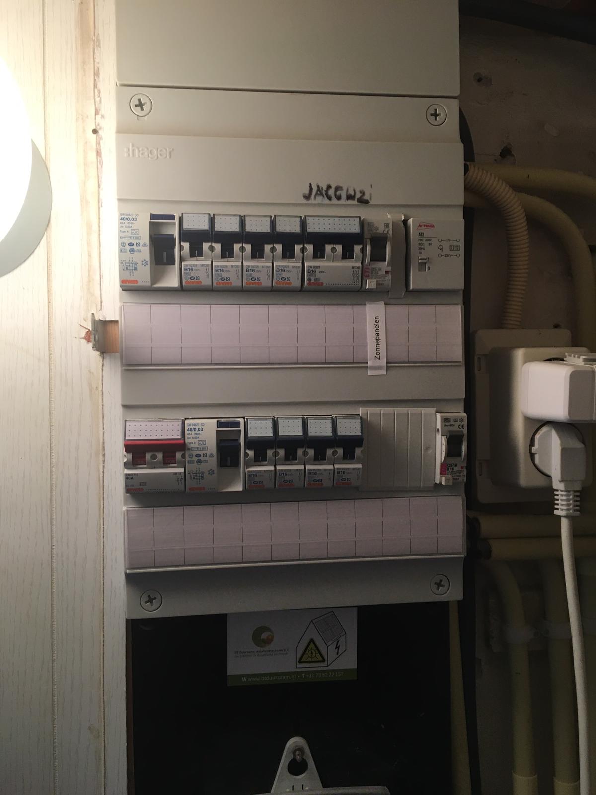 De meterkast is uitgebreid met een aparte groep voor de zonnepaneelinstallatie. Op de foto hieronder is de omvormer afgebeeld die de stroom van de panelen omzet naar bruikbare stroom. Onder de omvormer ziet u een werkschakelaar. Tevens is te zien dat de omvormer is voorzien van een utp internet aansluiting.