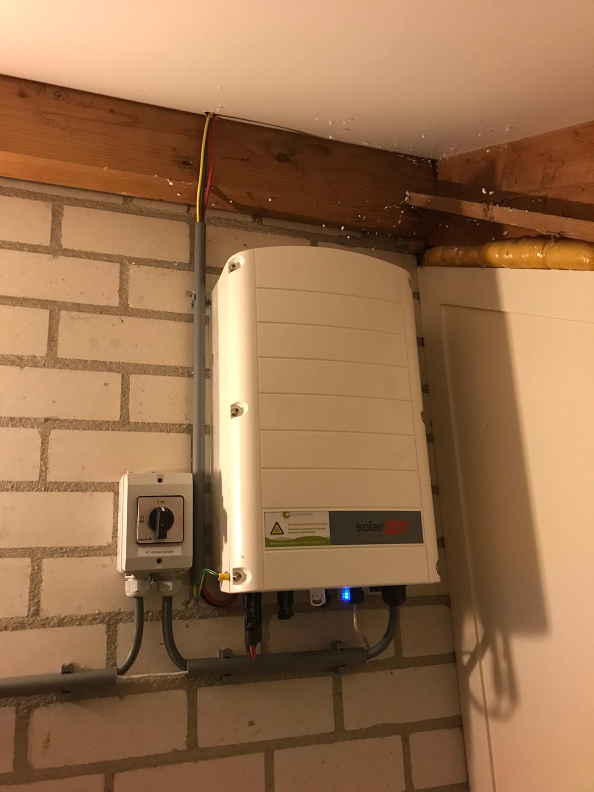 De meterkast is uitgebreid met een aparte groep voor de zonnepaneelinstallatie. Op de foto hieronder is de omvormer afgebeeld die de stroom van de panelen omzet naar bruikbare stroom. Onder de omvormer ziet u een werkschakelaar. Voor de online monitoring is er gekozen voor een utp aansluiting.