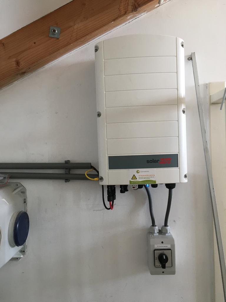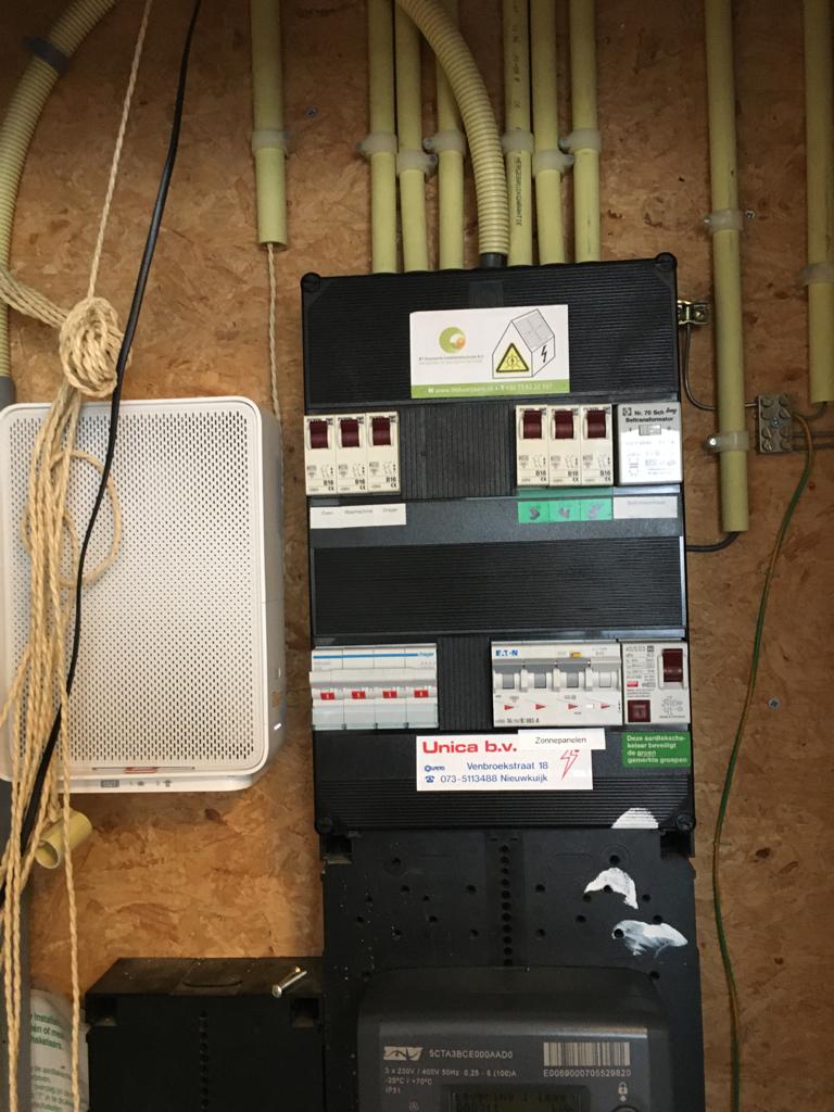 De meterkast is uitgebreid met een aparte groep voor de zonnepaneelinstallatie. Op de foto hieronder is de omvormer afgebeeld die de stroom van de panelen omzet naar bruikbare stroom. Onder de omvormer ziet u een werkschakelaar. Voor de online monitoring is er gekozen voor een Wifi antenne. Daar waar een utp aansluiting niet mogelijk kan toch worden gemonitord.