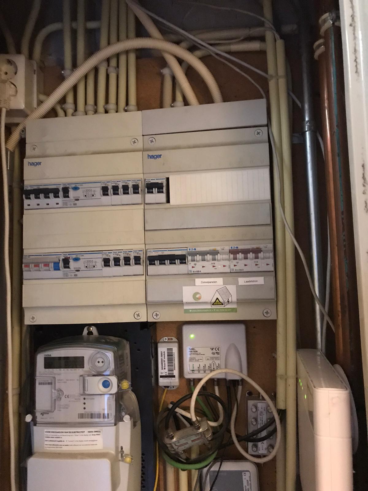 De meterkast is uitgebreid met een aparte groep voor de zonnepaneelinstallatie. Op de linker foto is de omvormer te zien met een utp aansluiting. Door een utp aansluiting te gebruiken bent u verzekerd van zo min mogelijk complicaties tijdens uw online monitoring.
