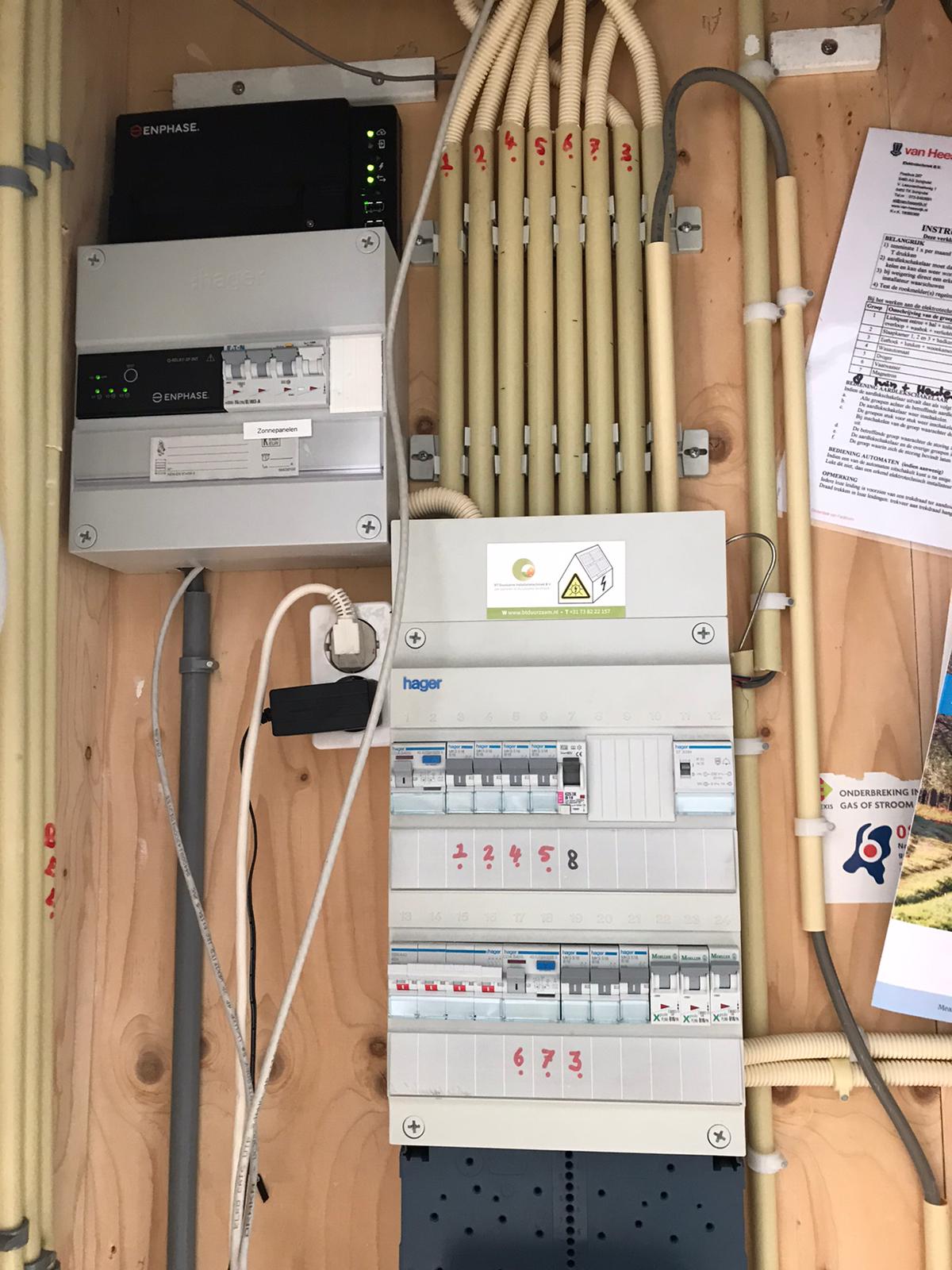 De meterkasten zijn beide voorzien van een aparte groep t.b.v. de zonnepaneel installatie. Ook is er in de meterkasten een Envoy module geplaatst. Dit is het brein van de installatie. Tussen het verzamelen van real-time gegevens van uw micro-omvormers en het op afstand versturen van updates naar deze omvormers door, zorgt de Envoy ervoor dat uw volledige PV-systeem continu blijft communiceren.