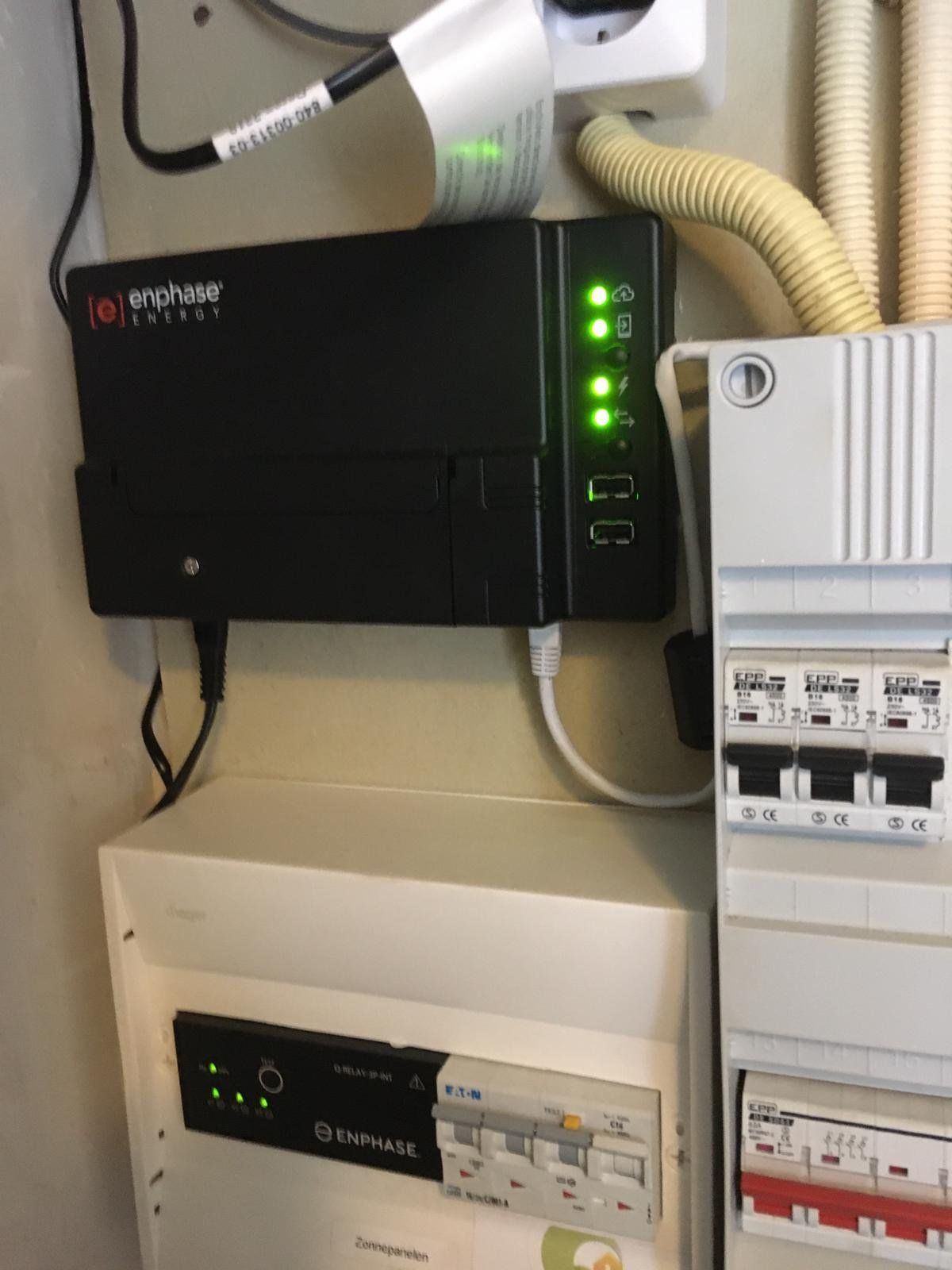 De meterkast is uitgebreid met een aparte groep voor de zonnepaneelinstallatie. Op de rechter foto is een Envoy van het merk Enphase afgebeeld. De Envoy verzorgt de communicatie tussen micro omvormers en de monitoring. Enkel dit apparaat wordt in de woning geïnstalleerd bij een Enphase systeem.
