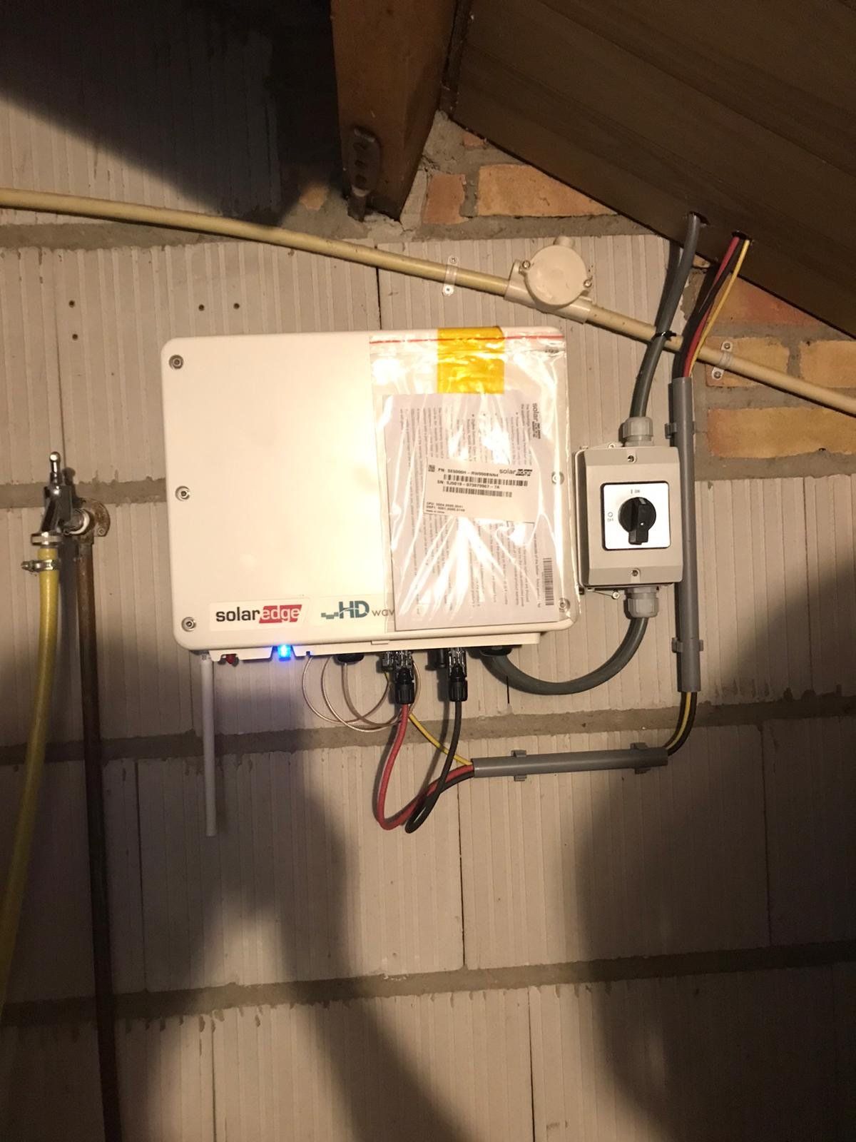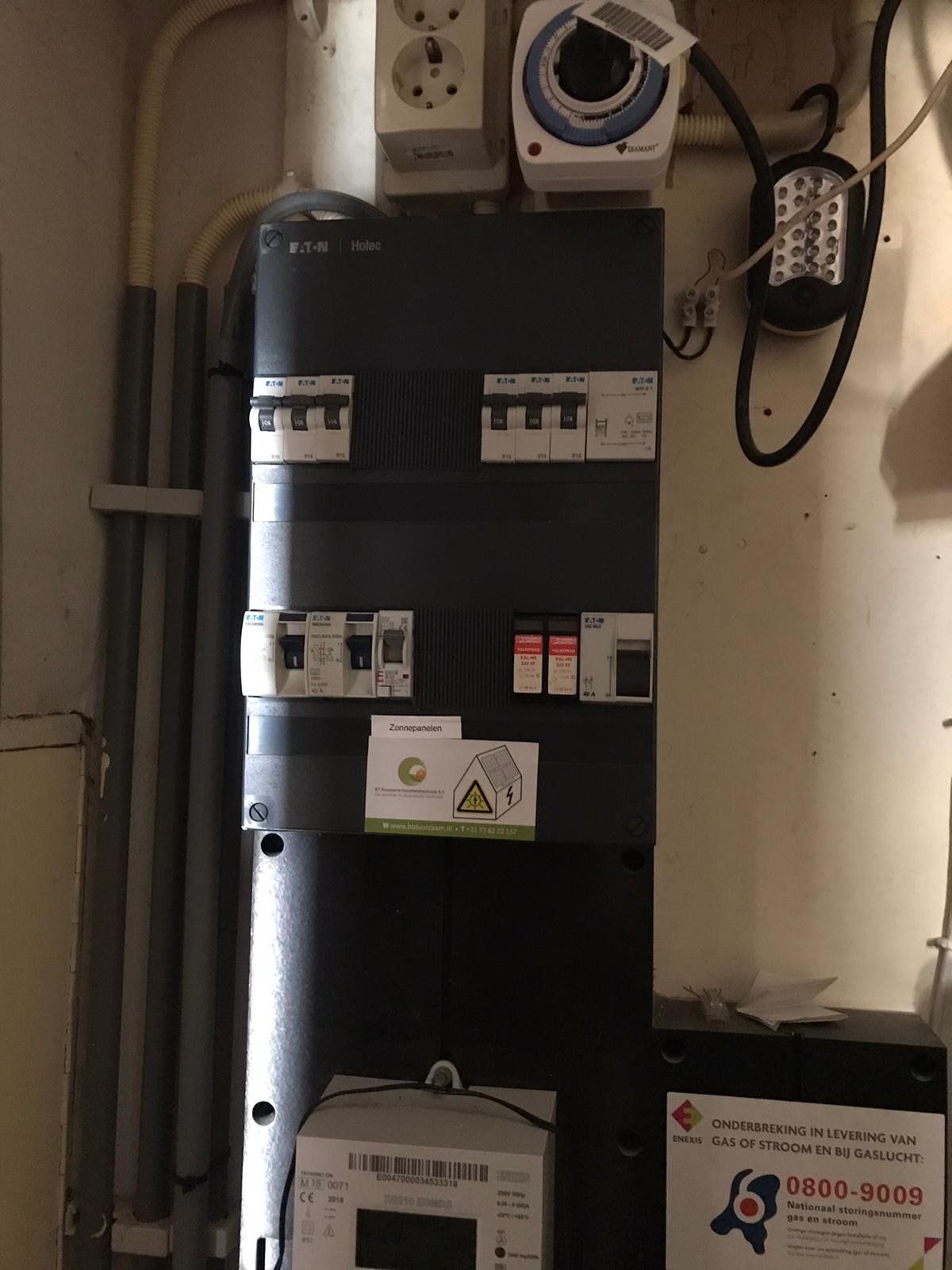 De meterkast is uitgebreid met een aparte groep voor de zonnepaneelinstallatie. Op de foto hieronder is de omvormer afgebeeld die de stroom van de panelen omzet naar bruikbare stroom. Naast de omvormer ziet u een werkschakelaar. Tevens is te zien dat de omvormer is voorzien van een Wifi antenne. Ook wanneer utp bekabeling niet mogelijk is kun je via deze weg online monitoren.