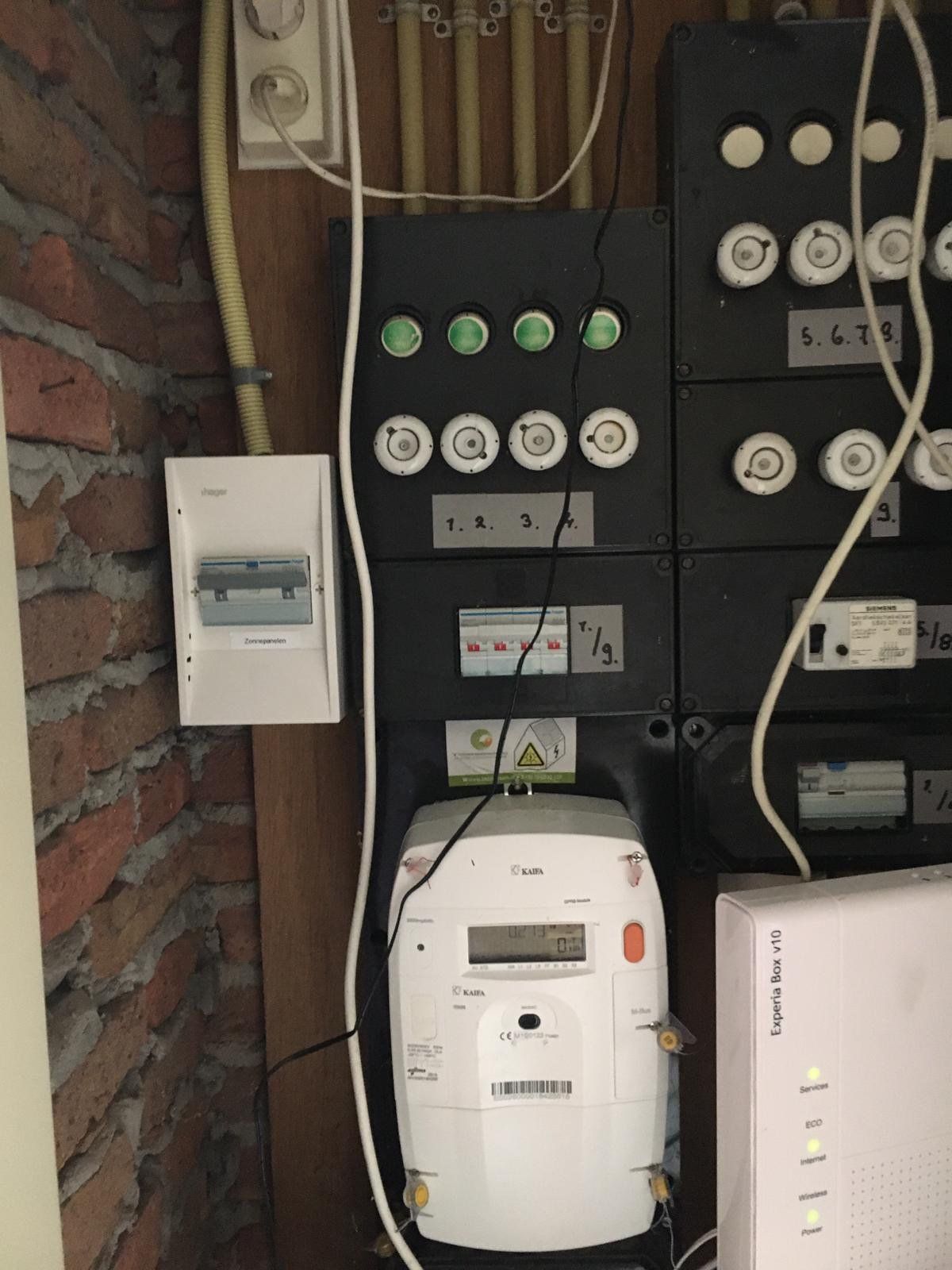 De meterkast is uitgebreid met een aparte groep voor de zonnepaneelinstallatie. Op de foto hieronder is de omvormer afgebeeld die de stroom van de panelen omzet naar bruikbare stroom. Tevens is te zien dat de omvormer is voorzien van een UTP ingang. Hierdoor is de omvormer klaar voor online monitoring!